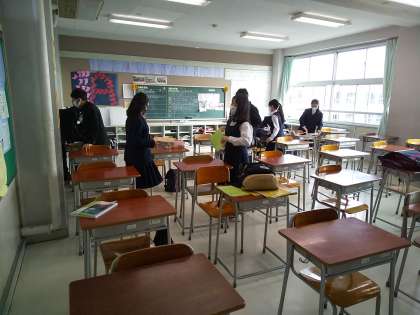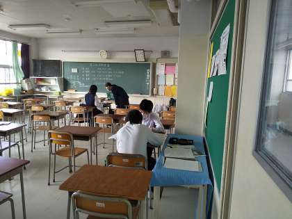朝8時10分。定期考査二日目です。朝早く登校した生徒たちが教室で試験勉強をしています。お互いに教えあう姿もありますね。今日もがんばっていきましょう。応援していますよ!