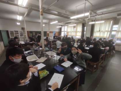 今回の実験では枝付きフラスコという専用の器具を使って、赤ワインを加熱してアルコールのみを採取するという実験です。生徒は皆、真剣に取り組んでいました。