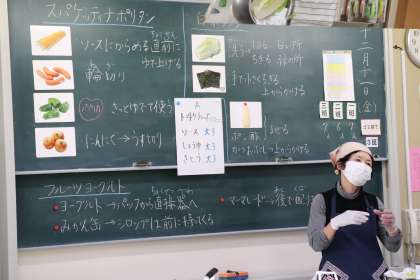 今日はナポリタンと白菜のサラダ、フルーツヨーグルトです。 初のデザートとあり、皆わくわくしていました。