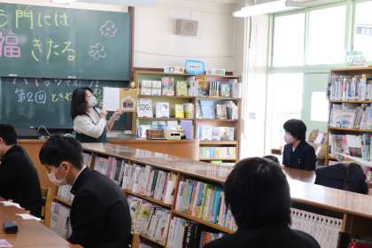 2学期は、感染予防のために教室で本の紹介を受けていましたが、今日は今年度初の図書館へ移動して本について学びました。