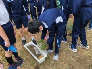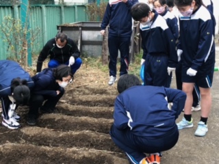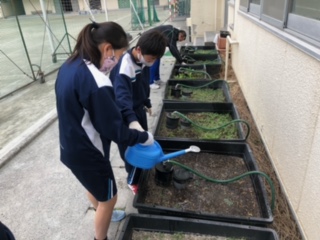 ときわ学級の総合的な学習の時間では、草花や野菜の栽培をしています。今日は、とても寒い一日ですが、少し前に蒔いた花と、大根や小松菜などの様子を見たり、水やりをしたりしました。トマトを育てた畑付近は、春先に新たな種を植えるために、きれいに片付けをしました。その際、調理実習で出た生ゴミを乾燥させたものを、堆肥として土に混ぜました。SDGsに絡めた学習です。大切な学習ですね。
