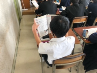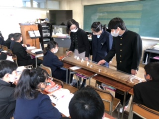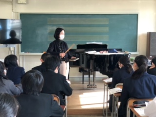 1年生の音楽の授業では、箏曲「六段の調」の鑑賞を行っでいました。初段から六段のフレーズにいく速度変化について学習したり、箏の旋律を「チントンシャン」と口唱歌したりしました。また、先生が実際に箏をひき、生徒が余韻の変化を促す「引き色」と「後押し」の奏法を行ったりもしました。生徒たちは、真剣に授業に参加していました。