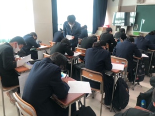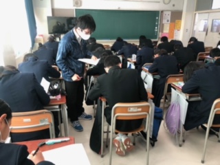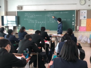 2年生の理科の授業では、「天気図」と「飽和水蒸気量の計算」を行なっていました。日本各地の天気、風向き、気温、風量、気圧(hPa)を聞き取り、地図に書き入れていく作業を、生徒たちは黙々と取り組んでいました。先生は、生徒たちの学習の様子を確認しながら机間指導を行っていました。