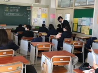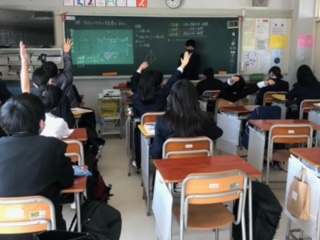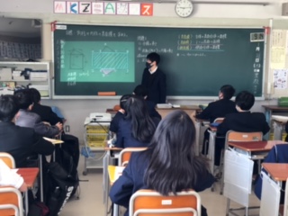 授業がんばっています(1年数学) 公開日 2021/01/21 更新日 2021/01/21 できごと 1年生の今日の数学授業の目標は、「角柱や円柱の表面積を求める」です。実物投影機を使って黒板に図形を映し出し、必要な文字や数字を入れながら説明を行なっています。 先生の質問には元気よく手があがり、やる気いっぱいの1年生です。