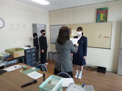 全校朝会の最後に、先日まで世田谷美術館で開催されていた世田谷区立中学校作品展覧会に出品されていた生徒の紹介がありました。放送室では、各教科で出品された代表生徒に校長先生から出品証が手渡されました。授業でしっかりと頑張ってきた成果ですね。おめでとうございます。