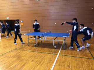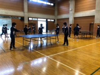 3年男子の保健体育の授業は「卓球」を行ないました。女子と同じく最初に基礎運動として「ロナウジーニョ式ブラジル体操で身体をほぐし、卓球台を準備します。今日は、初めてということで、4、5人で卓球台を囲み、軽いラリーを中心に練習しました。生徒たちはとても楽しそうです。