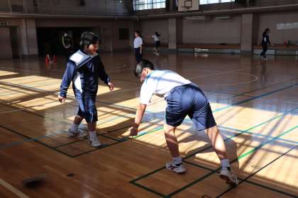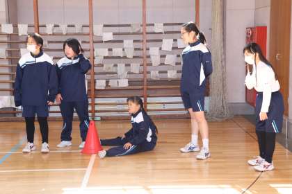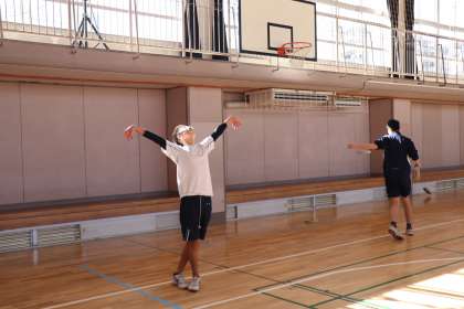 「並んで〜。練習するわよ〜。ドッジビーって、どうしてあっちこっちに行っちゃうのかしら。先生が拾うの大変になっちゃうのに〜。ゴメンね先生。」