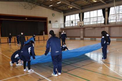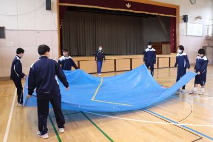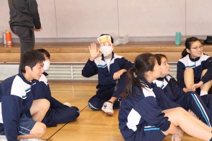 今日は体育の授業にも鬼が参加中。『節分ボッチャ』を一緒にやっています。鬼も礼儀正しく、生徒と一緒に列に入って並んでいます。
