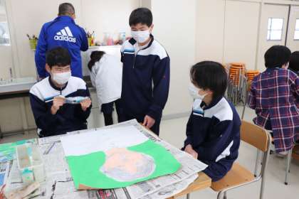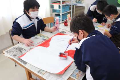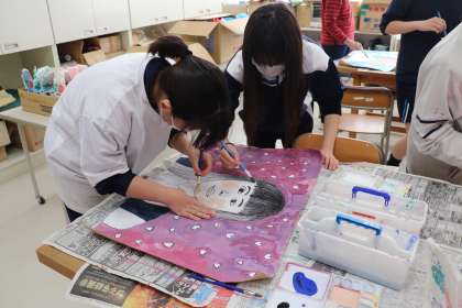 今日はお休みしている3年生の絵を、同じチームの2年生と1年生の生徒が、丁寧に色塗りに入ってくれました。「○○先輩には赤がピッタリだよな。」「○○先輩のために頑張ろう!」
