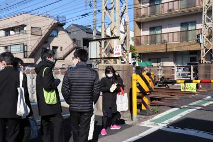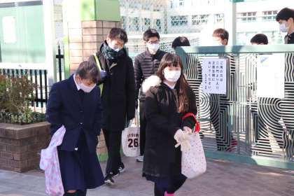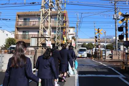 校門を出ます。「自動車や電車に気をつけようね〜。」「今日は空が青いね〜。」