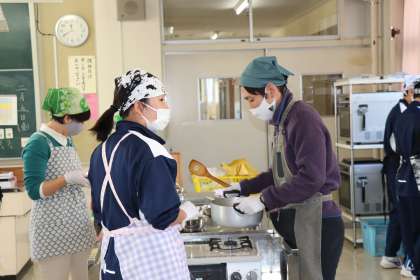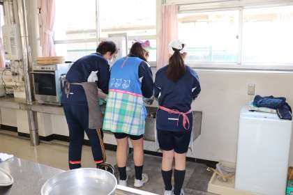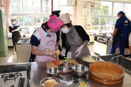 ときわ学級 調理実習 公開日 2021/02/05 更新日 2021/02/05 ときわ学級 「おいなりさんの油揚げができました〜。」「お、どうかな?お〜、いい色に煮つけられたね〜。おいしそうな色だ〜。」 「洗い物も3人でやれば早いね。」「そうだね〜。」 「あ〜、タマネギの皮をむいているのね。丁寧にむいているわね〜。」「はい!皮をむいたら切って、味噌汁の中に入れるんです。わたしが切ります。」