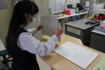 ときわ学級 日課表作り 公開日 2021/02/08 更新日 2021/02/08 ときわ学級 「せ〜んせっ!わたし、これで合ってる〜?」と職員室に確認に来てくれました。 「すごいね〜。キレイに作ったね〜。」「俺は〜、少しのズレも許さない。だから、丁寧に二つ折りにしたよ!」 「わたしは〜、今〜真剣に折っているから〜。お願い!話しかけないでね。」