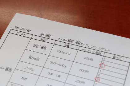 日課表を書き終わりました。次は、あさっての調理実習の買物を分担しました。あさっては、『マーボー春雨、中華スープ、ごはん、フルーツポンチ』を作ります。マーボー春雨は、ときわ学級の生徒の大人気メニューです。