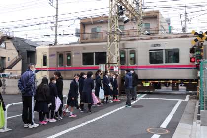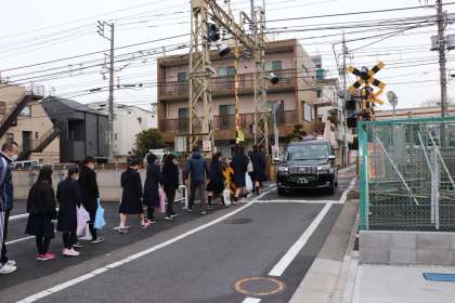 踏切の前でストップ!みんな先週の反省を活かせています。