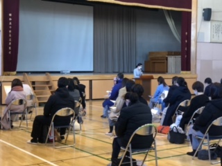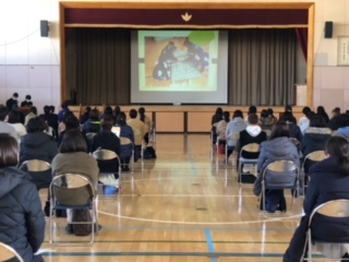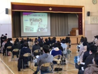 中学校の学習や、生活について先生から説明した後、生徒会の生徒たちが、自分たちの目で見た学校生活についてスライドを使って説明をします。