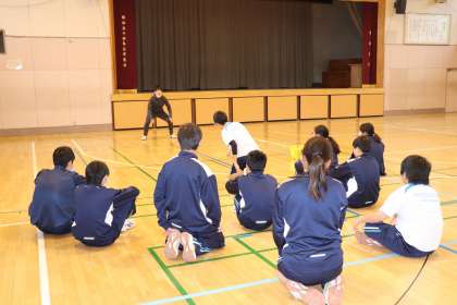 先週でドッチビーの授業が終わり、今週からはティーボールです。今日は第1回目ということで、全員で準備運動を行ったあとはグループに分かれてキャッチボールの練習です。「ボールは、体の真正面でキャッチしよう!」を合言葉に体を動かしています。