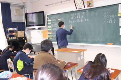 今日は小学生の体験入学の日です。2人の小学生が参加しています。お互いに自己紹介をした後は、日課表を書いています。小学生も中学生に遅れずに書いています。