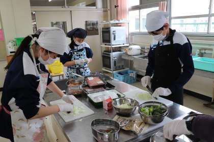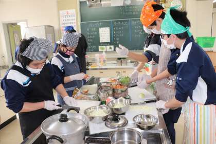 ときわ学級 調理実習 公開日 2021/03/06 更新日 2021/03/05 ときわ学級 9月から再開した調理実習も、今日をいれてあと2回です。新型コロナ感染症対策を行いながら進めてきました。最後の1回まで行えるように、しっかりと対策をとっていきます。 今日は3年生のリクエストメニューでした。『チーズインハンバーグ、オニオンスープ、レタスとブロッコリーのサラダ、オニオンスープ、カルピスゼリー』です。