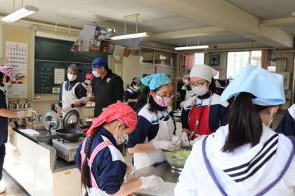 3年間で経験する調理実習は100回ほどになります。1年生の頃は野菜を切るのも大変だった生徒が、3年生になると野菜だけでなく、滑って切りにくい肉も上手に切るようになります。