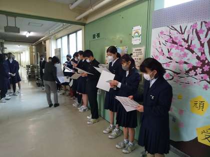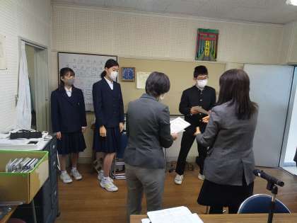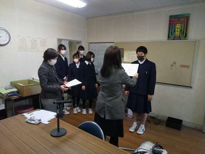 生徒朝会に引き続き表彰も行われました 公開日 2021/03/08 更新日 2021/03/08 できごと 生徒朝会に引き続き放送室では、表彰が行われました。今日は東京都の書写展での入賞者の表彰です。本校から多くの生徒が入賞を果たすことができました。多くの所での松中生の活躍、本当に素晴らしいですね。表彰の後、廊下で担当の先生から優秀作品が掲載された文書をもらっていました。入賞したみなさん、本当におめでとうございます。