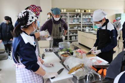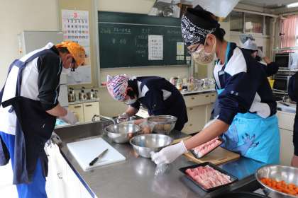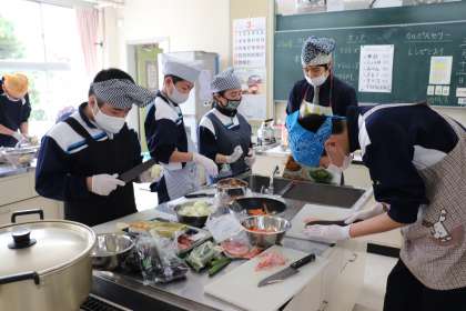 ときわ学級 調理実習 公開日 2021/03/12 更新日 2021/03/12 ときわ学級 やっぱり、今日も『3年生最後の〜』が、ありました。 今日は3年生最後の調理実習でした。生徒にメニューの希望をとったところ、『カレーライス、コールスローサラダ、カルピスゼリー』が今年度最後のメニューとなりました。