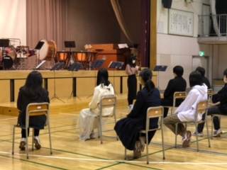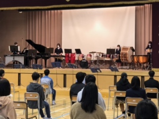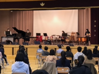 総合発表会(3年生) 公開日 2021/03/13 更新日 2021/03/13 できごと 今日は、今年度最後の土曜授業日です。卒業を前に、3年生は総合発表会を行いました。司会進行は、生徒たちが行います。開会の言葉に続いて吹奏楽部の演奏です。一曲めは、打楽器+特別参加のピアノを入れて構成された曲の演奏です。