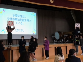 総合発表会(3年生) 公開日 2021/03/13 更新日 2021/03/13 できごと 次のプログラムは、「松中どれだけ知っているかマルバツクイズ」です。学年の先生方の知られざる姿が明らかに!?先生方の意外な一面を知って、会場は大いに盛り上がりました。