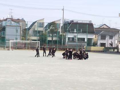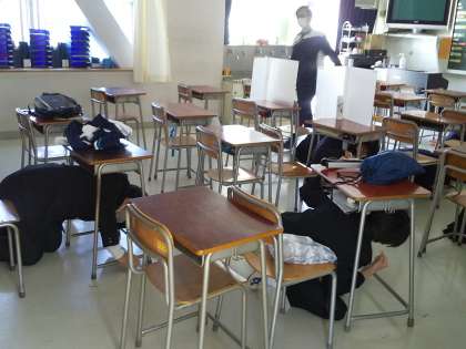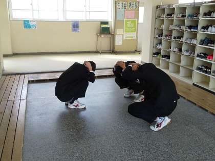 今日の昼休みには、事前の予告なしで避難訓練を行いました。普段通り校庭や廊下なので思い思いに過ごしていたところ、突然の緊急放送が入りました。生徒はその放送の内容をよく聞いて、それぞれがふさわしい行動をとっていました。たまたま玄関にいた生徒はその場でしゃがみ頭部を保護します。校庭では中央部分に集まり、同様にしゃがみます。ときわ学級の教室にいた生徒は、頭を机の下に入れて頭部を守っていました。