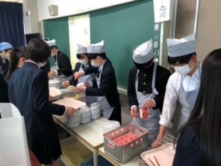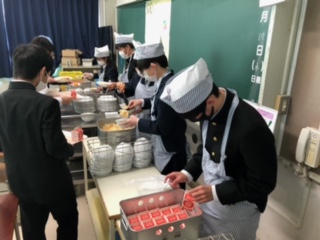 3年生にとっては今日が中学校生活最後の給食です。今日のメニューは『鯛めし、筑前煮、くだもの(せとか)、牛乳』です。多くの人が小学校から9年間食べ続けてきた給食。いつか「懐かしいなあ」と思う日が来るかもしれませんね。今日も手指消毒をバッチリして、しっかり配膳作業を進めていました。