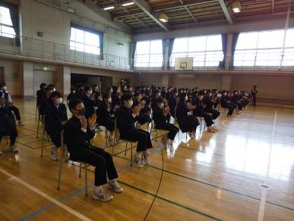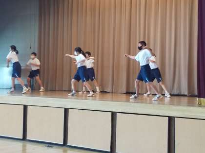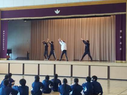 まず午前中はダンスの発表会です。体育の授業で行ったダンスの中から選抜グループが演技を発表をすることになったのです。和気あいあいとした雰囲気の中、クラスから選ばれた2チームずつがステージで演技を披露しました。見ている学年の仲間たちは、大きな拍手で声援を送ります。そして、最後は飛び入りで学年の先生たちによるダンスの発表です。思わぬ出し物に生徒たちは大喜びで、音楽に手拍子でダンスを盛り上げていました。校外学習が中止になったのは本当に残念ですが、このように楽しい時間を過ごせるのはありがたいことです。