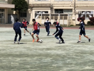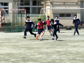 男子のサッカーは、コートを二つとってミニサッカーゲームをしています。みんなボールに食らい付いています。