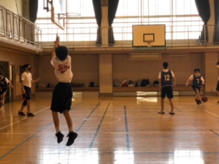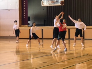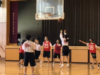 バスケットボール部は、女子は5対5.、男子はシュート練習をしています。みんな真剣です。