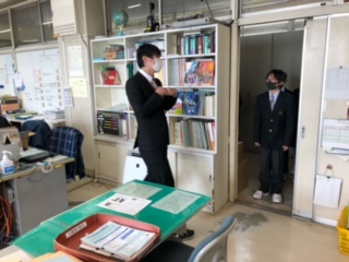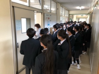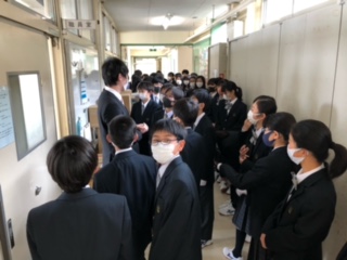 校舎巡り(1年生) 公開日 2021/04/09 更新日 2021/04/09 できごと 1年生は、クラスごとに校舎巡りを行いました。写真はちょうど職員室前で、職員室の入り方について確認をしているところです。代表で入室の流れを実演した生徒は、「失礼します!1年〇〇組の〇〇です。〇〇先生をお願いします!」と、とてもしっかりした言葉遣いと態度でした。1年生の皆さん、早く松中の校舎にも慣れてくださいね!