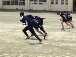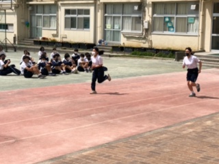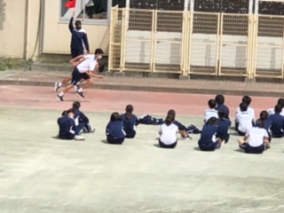 ?まだ学期初めなので、各学年で特別時間割を組んで授業を進めています。3年生は、保健体育の授業で短距離走を行っていました。明るい日差しの中、何本か練習をした後、いよいよタイムの計測です。みんなフライングしないように気を付けて、一生懸命走っていました。