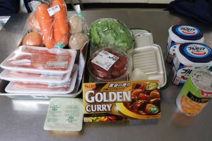メニューはカレーライス、サラダ、フルーツヨーグルトです。