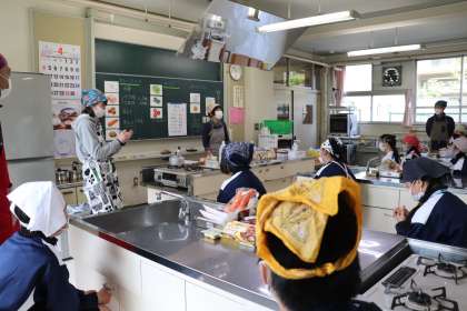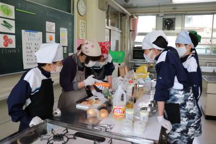 全体で調理方法の確認や、注意事項を聞いた後、1年生はピーラーの使い方を学びました。