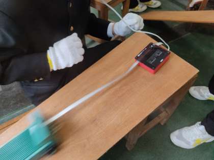 3年生の理科の実験では力学台車を使って斜面の傾きによってどのように加速度が変わるかを実験しています。