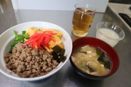 今日のメニューは3色丼ですが、紅生姜や炊飯器に入れた昆布などが入り、最後は5色丼になりました。