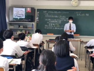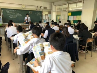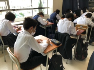 2年生の社会科の授業では、授業の初めに簡単な復習確認小テスト(5問ぐらいの簡単なテストです)を行っています。授業前の休み時間には、生徒たちは友達同士で問題を出し合ったり、ノートを見直したりしているようです。