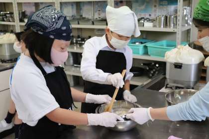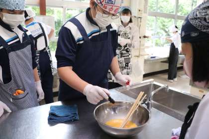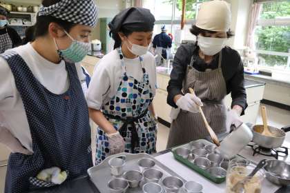 カップの底には、カラメルソースを家庭科の先生に入れてもらいました。