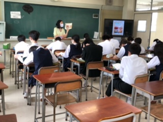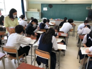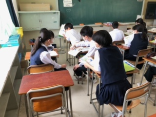 今日の2年生の英語の授業は、教科書の本文を中心に新しい英単語や本文の内容、本文で使われている大切な文法の確認をしながら、テンポよく進んでいきました。個人での学習、ペア学習、グループ学習など学習効果を考えた様々な形態で、生徒たちは熱心に学習に臨んでいました。