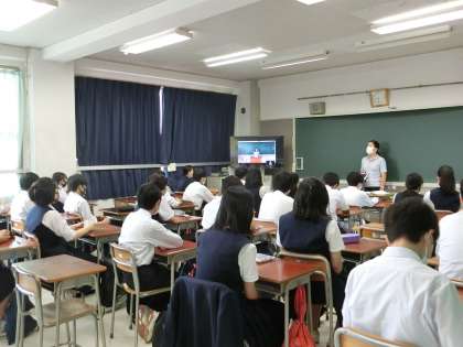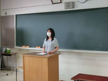5月を振り返り「がんぱったこと」「よかったこと」をキャリアパスポートに記しました。苦手なことや不得意なことを克服していくことも必要ですが、自分の努力やがんばりに注目し、自分の得意なことをどんどん伸ばして自分を好きになりましょうというお話でした。生徒のみなさんが書いた内容も具体的に紹介していただきました。