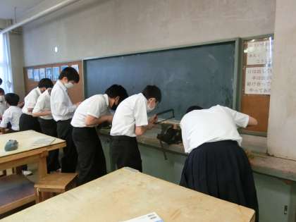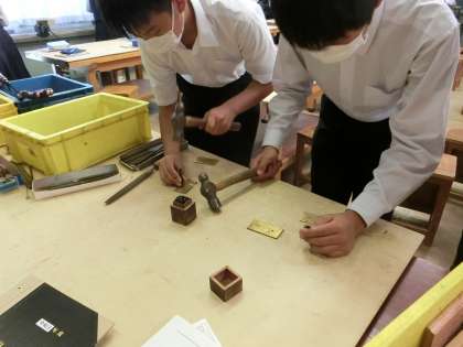 2年生の技術では金工に取組んでいます。削ったり、穴をあけたり、打ったり、磨いたり。いろんな道具を駆使して作り上げています。