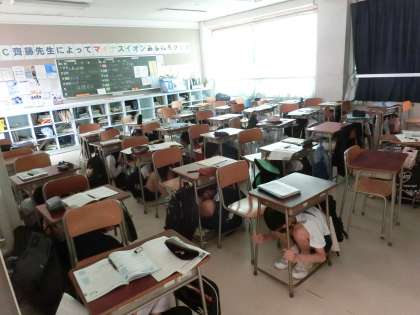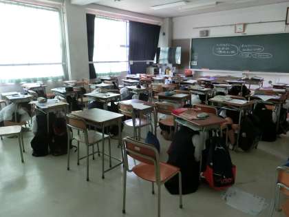 6時間目も終わりに近づいた15時20分。緊急地震速報の音とともに「訓練 訓練」の放送が入りました。音が鳴ると同時に教室にいる生徒たちは机の下に身を隠します。これはとても素早く行動することができていました。