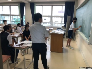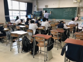 3年生の数学の授業は、少人数授業展開。「2次方程式を効率よく解く方法を考える」ということについて学習を進めていました。みんな熱心に授業に参加しています。
