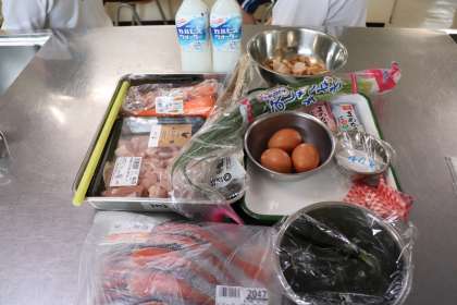今日は1学期のリクエストメニュー第一弾ということで、炊き込みご飯とすまし汁、焼き魚にカルピスゼリーを作りました。