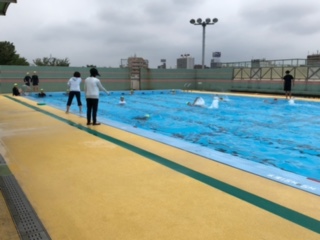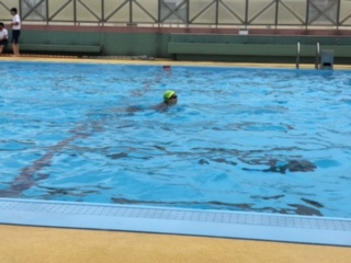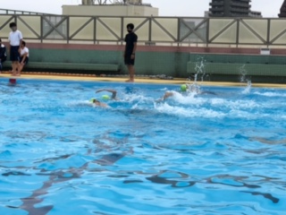 3年生は水泳の授業を行っています。クロールや背泳ぎ、平泳ぎなど25mを力強く泳いでいます。