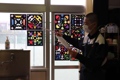 紺色や黒色の厚紙を切って模様を作り、裏から色とりどりの和紙を貼って仕上げました。