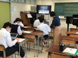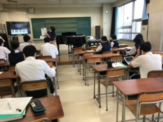 3年音楽の実技は、タブレットに入っているアプリを使って旋律をつくる作業を行なっていました。みんな真剣です。