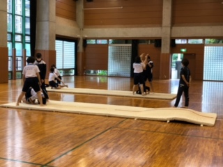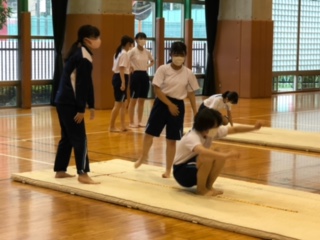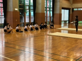 ?3年保健体育女子の授業はマット運動でした。三点倒立の練習をした後、三点倒立、前転、開脚前転など、流れに沿った技の実技テストをしていました。